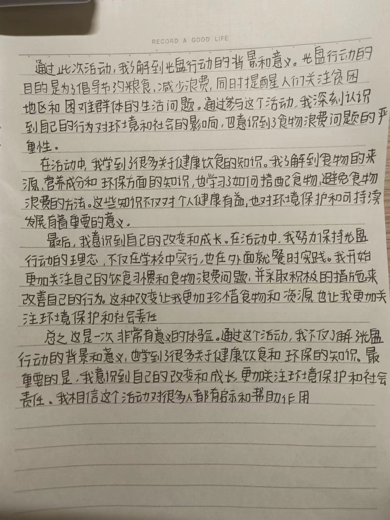 同学们从自身做起,坚持“不点多,不浪费,不剩余”的原则,积极参与此次活动,使活动取得了显著成效。这次活动不仅提高了同学们的节约意识,还帮助他们养成了良好的饮食习惯。希望通过此活动,将厉行节约、反对浪费理念牢牢树立在同学们的心中,让“光盘”成为一种习惯,做“光盘行动”的践行者。