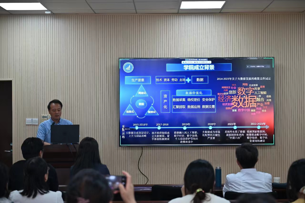 杜军威介绍了学院成立背景、发展历程、学位点建设、实验室建设规划等内容,并为家长详细介绍了学院建设“精、专、强”的新型现代产业学院的办学定位及基于政务大数据的智慧城市建设与管理、基于空天海地大数据的行业服务、基于工业大数据的企业技术服务的发展方向。
