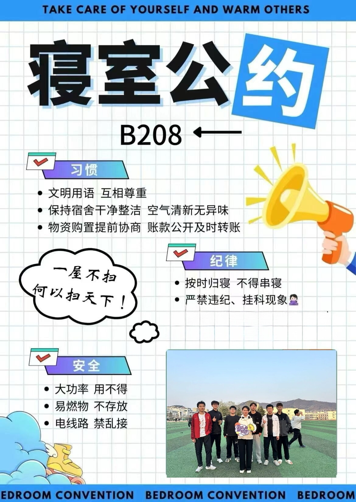 本次大赛自启动以来,就受到了同学们的热烈响应和积极参与。各宿舍成员充分发挥创意,紧密结合日常生活实际,制定了各具特色的宿舍公约。这些公约不仅涵盖了宿舍卫生、作息时间、电器使用等常规管理事项,还融入了团队合作、互相尊重、共同进步等积极向上的价值观。不仅体现了宿舍成员间的智慧和创意,也展现了他们对宿舍文化建设的深刻理解和积极实践。