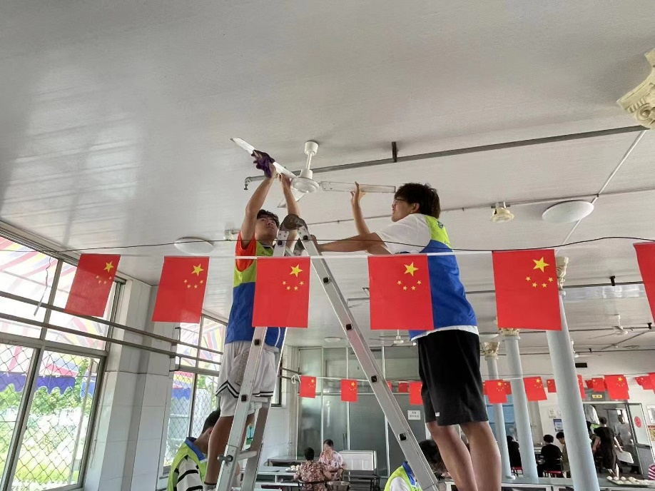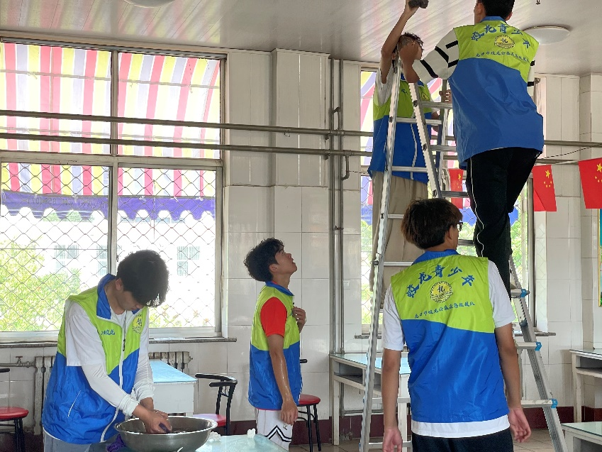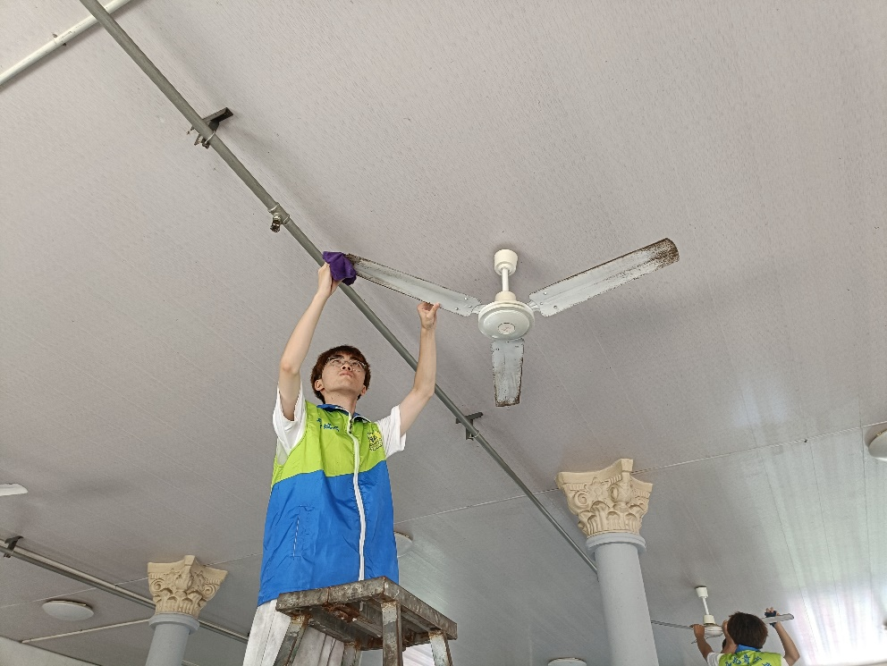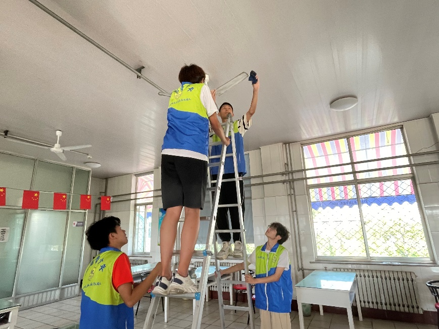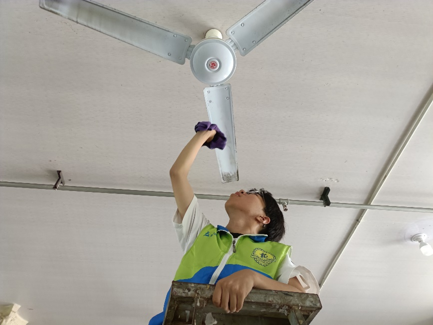 同时,还有学生爬上梯子,细心擦拭着天花板上的风扇,确保老人们在即将到来的炎炎夏日里能够享受到清凉与舒适。