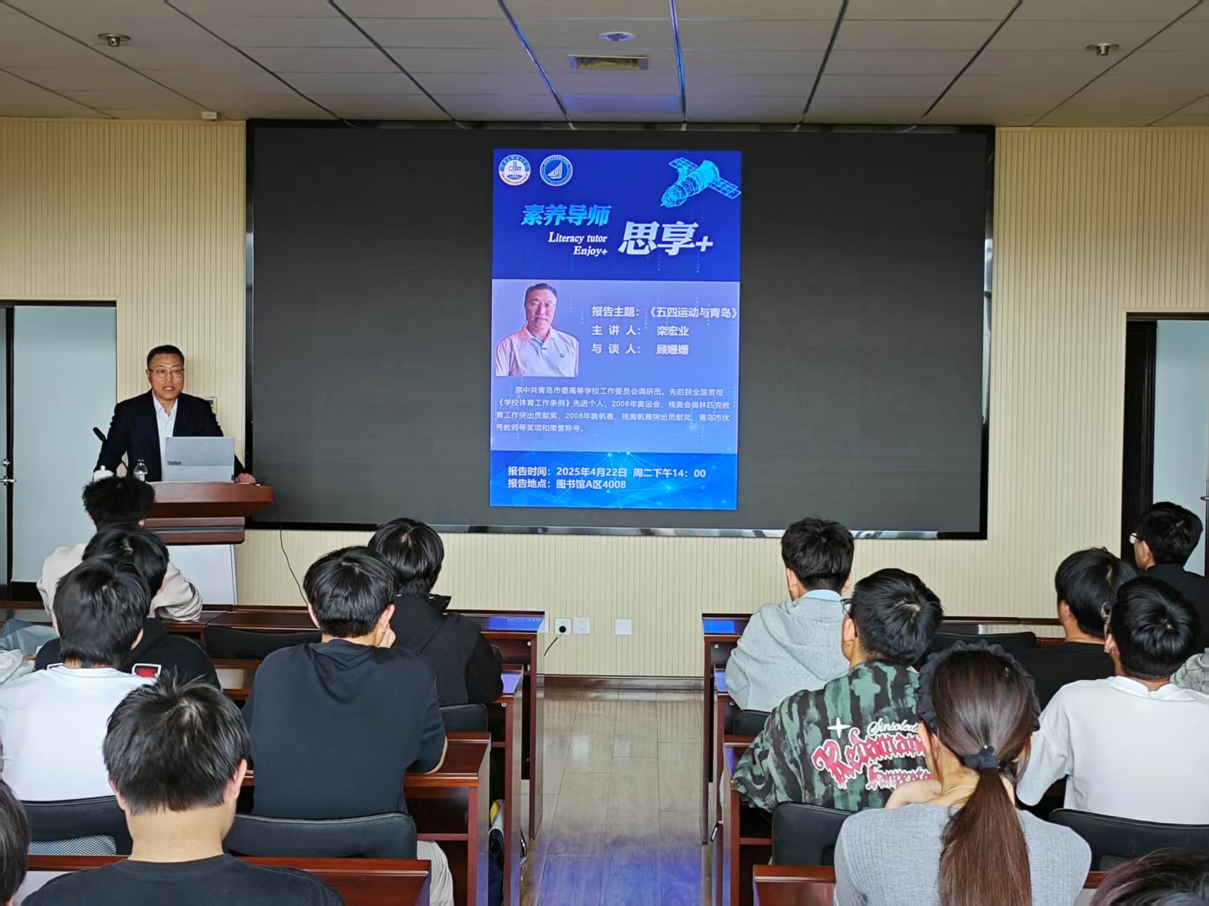 为提升学生综合素养,弘扬爱国主义精神,4月22日下午,2026美加墨世界杯官网在图书馆A区4008成功举办青马工程培训班之“素养导师思享+”第十期活动。本期课程以《五四运动与青岛》为主题,特别邀请原中共青岛市委高校工委调研员栾宏业担任主讲嘉宾,吸引众多学生参加。