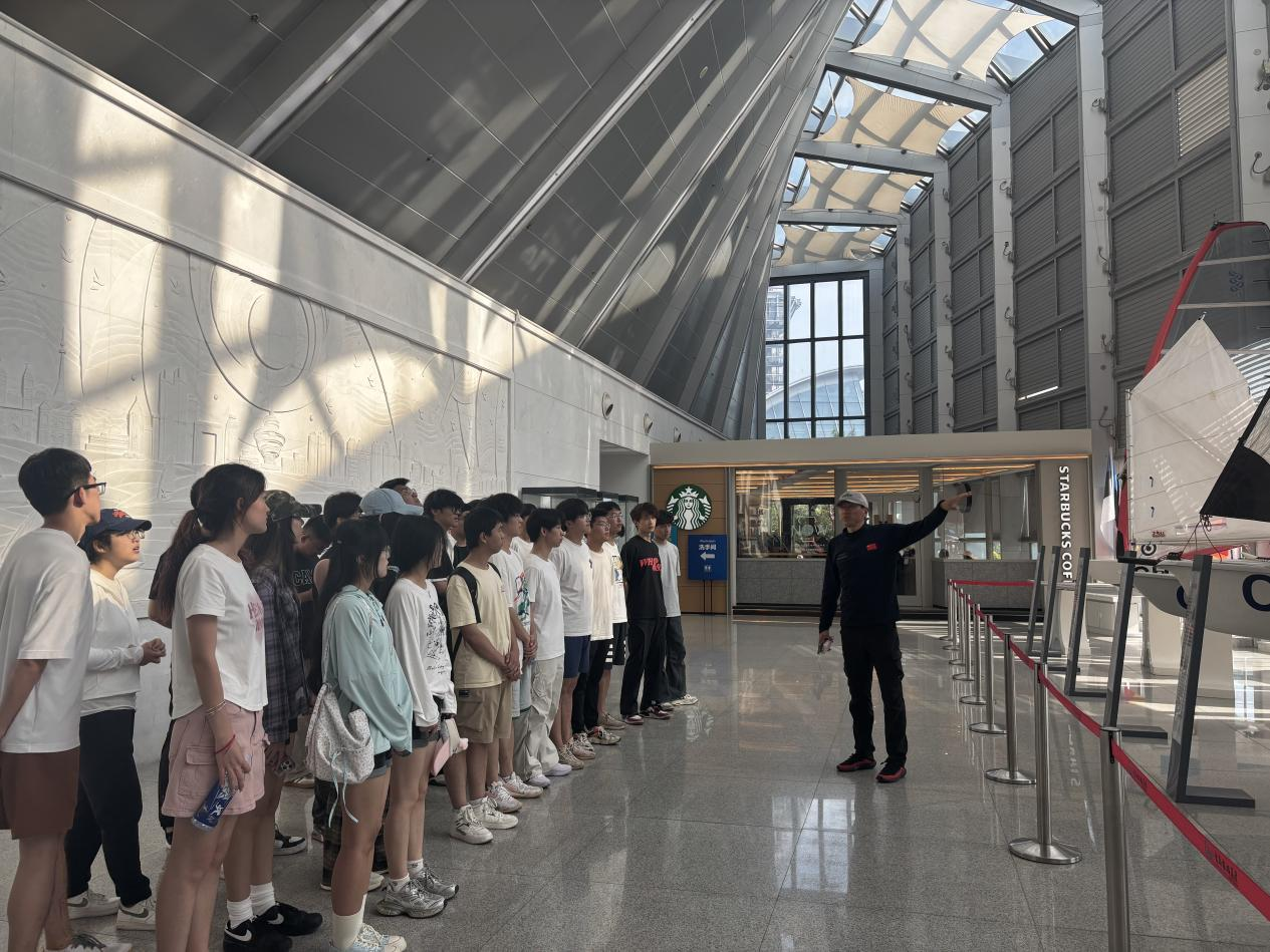登上帆船后,“海上实践课”正式拉开帷幕。航行过程中,教练结合实际操作,深入解析风力驱动帆船的原理,并指导同学们感受风与帆的动态配合。同学们亲手调整帆具,在海浪起伏间,将理论知识转化为实践技能,切身体会“知行合一”的素养提升。实践结束后,同学们走进奥帆博物馆,开启“文化素养研习”之旅。馆内,2008年奥运会参赛帆船、帆船历史长廊等展品,生动展现了帆船运动的发展脉络。大家积极参与“航海知识问答”“模拟帆船驾驶”等互动活动,在奥运领奖台打卡留念,沉浸式感悟奥运文化与航海精神的交融,进一步滋养了文化素养根基。