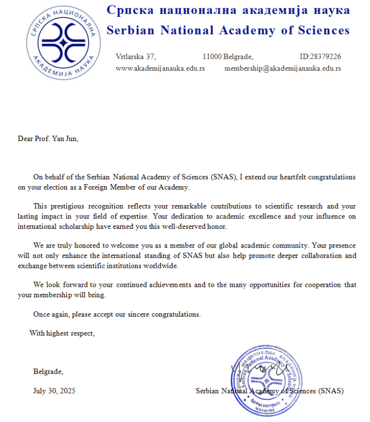 塞尔维亚国家科学院在贺信中表示,颜军院长当选外籍院士是对其“在科学研究方面的杰出贡献及在专业领域产生的深远影响”的高度认可。信中强调,“他对学术卓越的不懈追求和对国际学术界的深远影响,让其荣获这一名誉实至名归”,并将有助于推动全球科研机构之间更深层次的合作与交流。