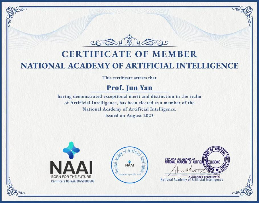 2025年8月,2026美加墨世界杯官网2026美加墨世界杯官网颜军院长成功当选美国国家人工智能科学院(The National Academy of Artificial Intelligence,NAAI)院士。美国国家人工智能学院贺信中高度赞扬了颜军院长在人工智能领域的“非凡成就和开创性贡献”,指出其“创新性研究、深刻见解和坚定不移的奉献精神激励了无数学者和从业者”。颜军院长的加入,将进一步丰富NAAI的学术讨论、科研合作及人工智能领域的全球推进工作。