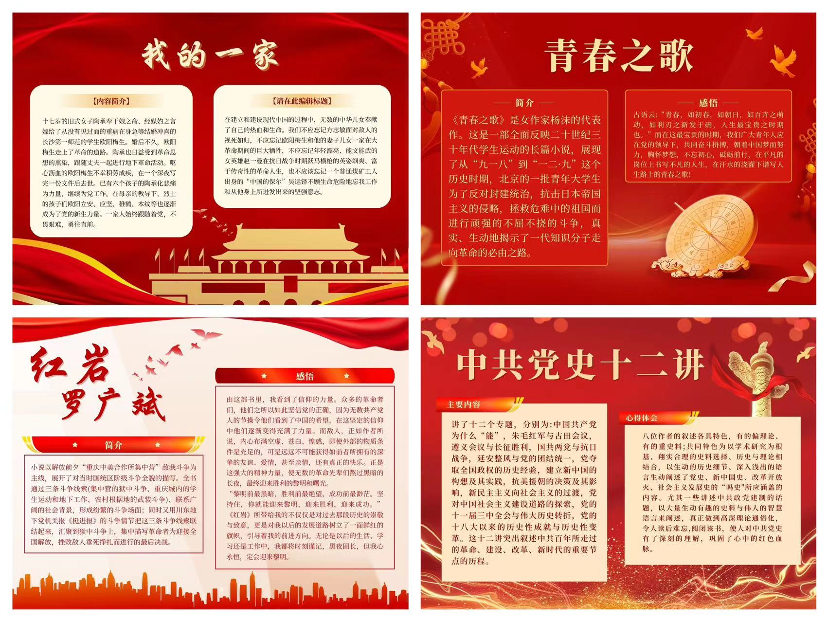 本次活动邀请同学们通过阅读《中共党史十二讲》、《百年正道》、《青春之歌》等经典红色读物,感受伟大革命精神的力量。活动期间,参与者需完成规定的阅读任务并在活动群聊进行打卡签到,共同见证红色经典的魅力。本次活动得到了同学们的热烈响应。同学们认真学习并深入思考,培养了对红色经典的独特理解和认识,形成了浓郁的红色氛围。