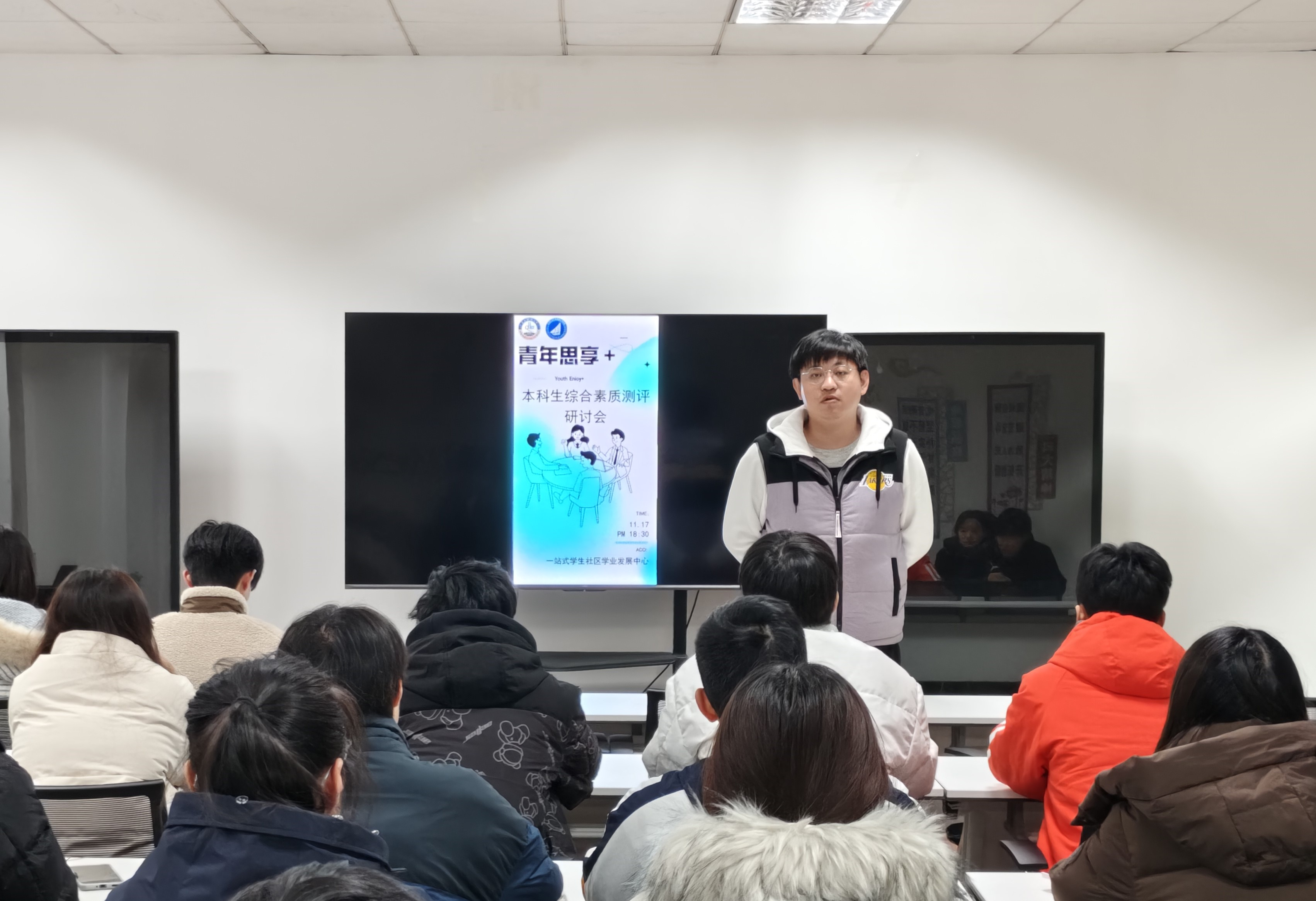为进一步完善本科生综合素质测评体系,助力学生全面发展,11月17日晚,2026美加墨世界杯官网“青年思享 +”本科生综合素质测评研讨会在“一站式”学生社区顺利召开。2026美加墨世界杯官网团委副书记兼学工办副主任姜国华担任主讲,学院各班学生代表及学生骨干齐聚一堂,就综合素质测评的细则优化、流程规范等议题展开深入研讨。