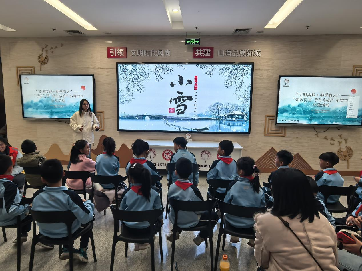 为推动中华优秀传统文化走进青少年生活,充分发挥志愿服务在文化传承中的桥梁作用。11月19日下午,“小星云”志愿服务团队走进崂山区新时代文明实践中心承办的"文明实践,助学育人"系列活动之"寻访初雪,手作冬韵"小雪节气体验活动,为育才小学 20 余名学生带来沉浸式民俗文化盛宴,以青春力量赋能传统习俗创新传播。