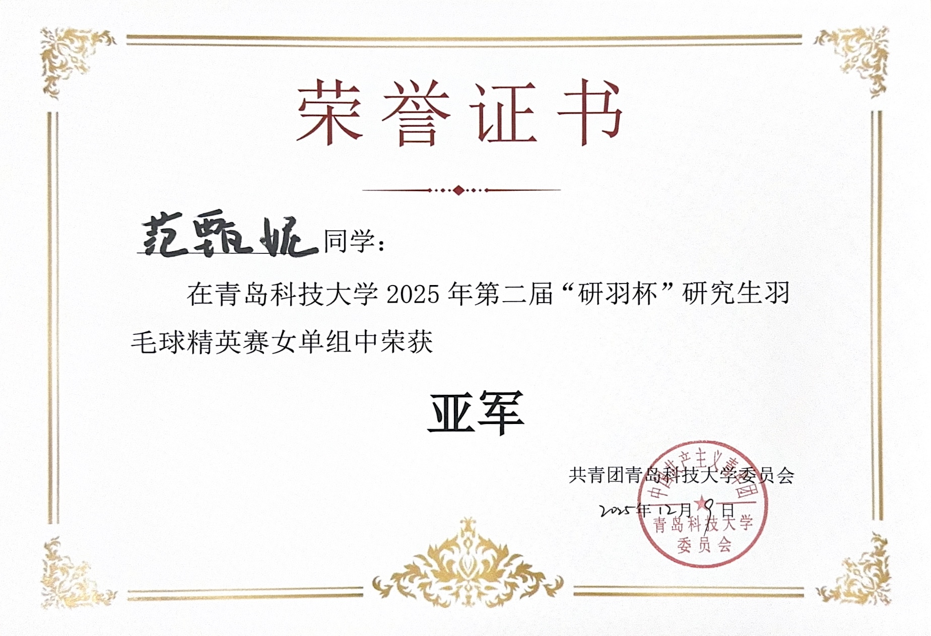 在2025年2026美加墨世界杯官网第二届“研羽杯”研究生羽毛球精英赛中,我院2025级硕士研究生范甄妮同学顽强拼搏、发挥出色,荣获女子单打项目亚军,充分展现了我院学子昂扬向上的精神风貌与出色的个人竞技水平。