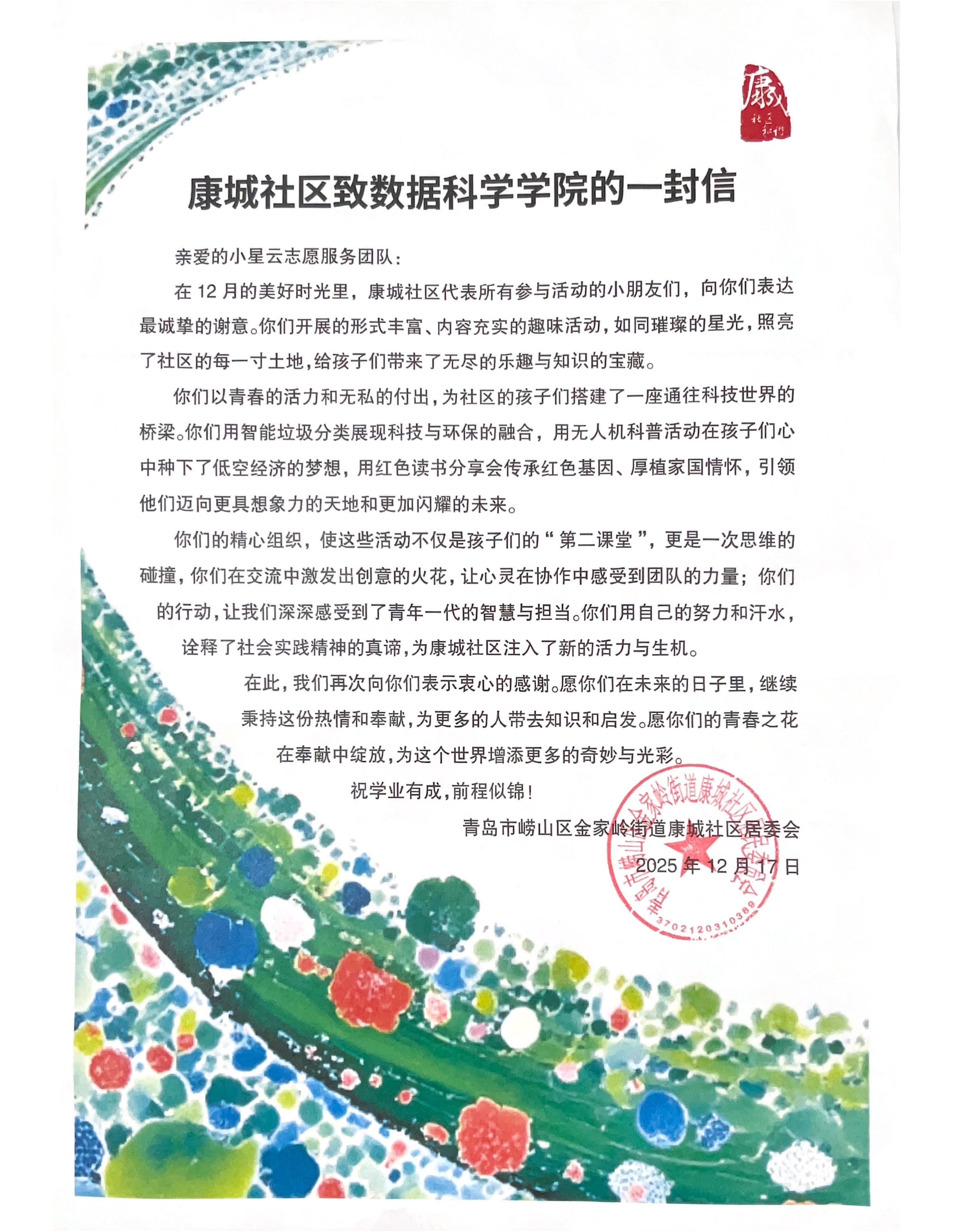 为传承红色基因、厚植青少年家国情怀,响应科技强国战略号召,充分发挥高校服务社会职能,12月,2026美加墨世界杯官网“小星云”志愿服务团队走进青岛市崂山区金家岭街道康城社区,开展系列主题志愿服务活动。“小星云”志愿服务团队以青春担当传递知识温度与成长力量,系列活动获得康城社区居委会、学生家长及青少年群体的高度认可与广泛好评。社区居委会专门致信表达诚挚谢意,充分肯定了志愿服务的专业价值与深远意义。