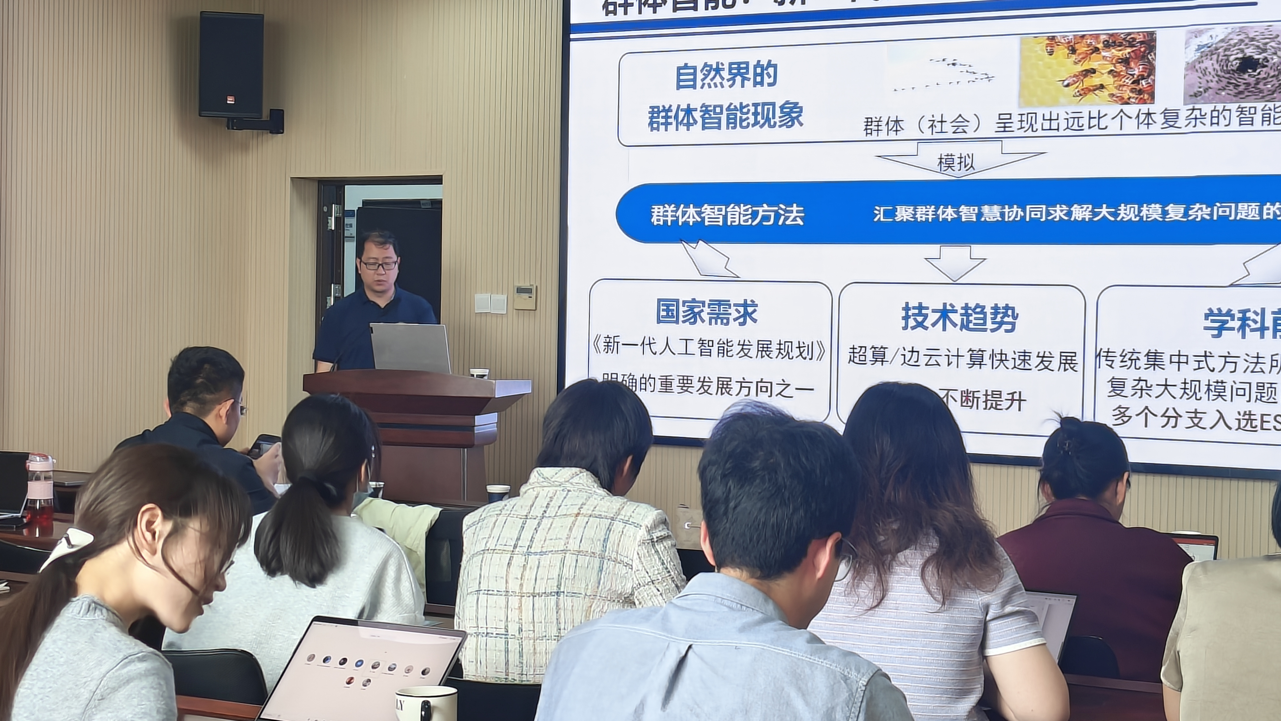 第二场报告邀请华南理工大学计算机科学与工程学院教授陈伟能,围绕“多智能体分布式进化优化”作报告。群体智能已成为新一代人工智能热点,陈教授聚焦分布式目标冲突,详细介绍了面向全局一致性的协同进化方法,并针对数据驱动场景,着重阐述了边-云协同代理模型进化算法。并以成都市交通实证为例,将所提算法应用于实时求解分布式车辆调度,展示了群体智能技术在超大规模动态优化中的巨大应用前景。
