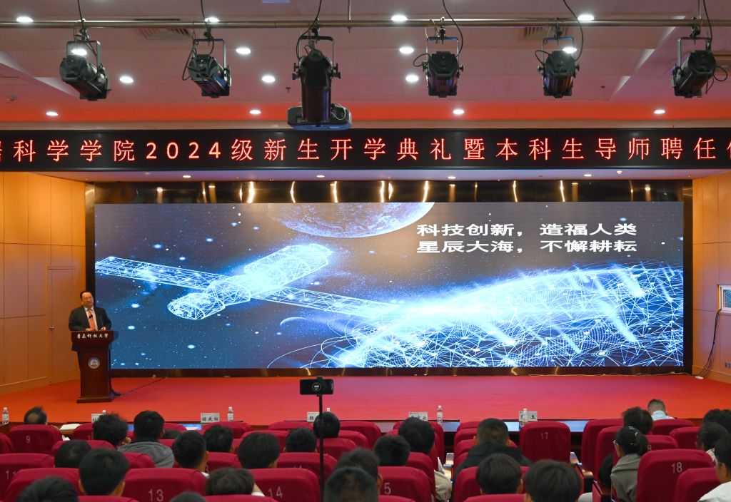 在庄严肃穆的国歌声中,典礼正式开始。首先,学院院长颜军发言,颜军回顾了学院的发展历程,强调了学院在“低空飞行”“智能技术”“空天地海大数据”领域的优势和成就,并鼓励同学们积极参与学院建设,共同谱写新的篇章。颜军向新生们提出了三点建议,希望同学们能够厚植家国情怀,做中国式现代化建设的参与者;培育创新意识,做科技强国的推动者;珍惜宝贵时间,做厚积薄发的追赶者。颜军寄语新生们,努力拼搏,为中国科技事业的发展贡献力量!