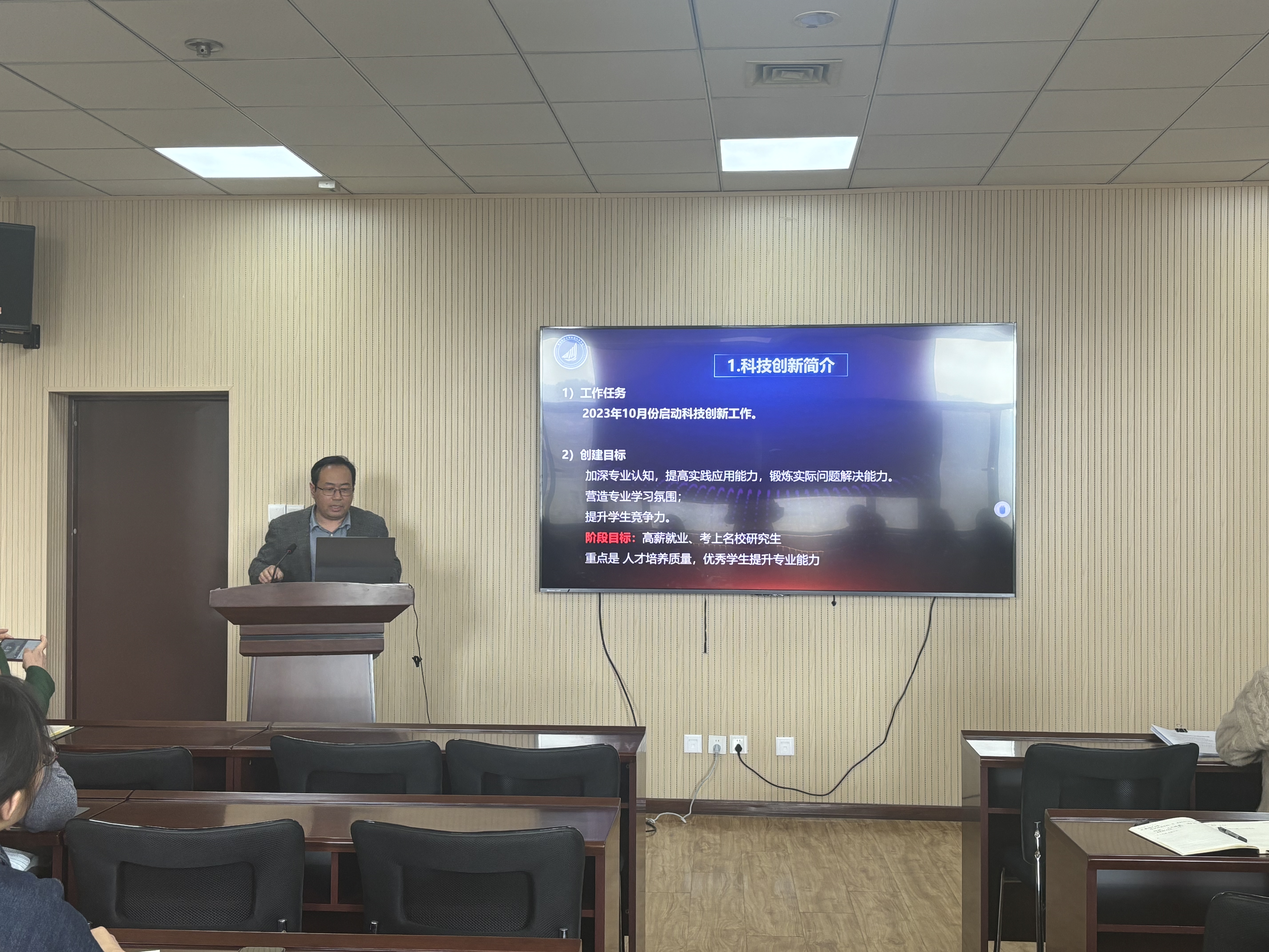 辅导员姜国华对学科竞赛的具体内容、参赛要求和注意事项进行了介绍,从队伍梯队化、结构健康化、项目多样化方面介绍了学生科创队伍建设。
