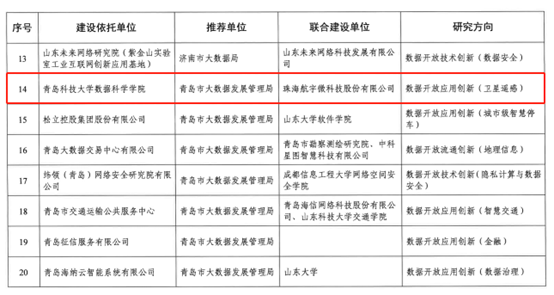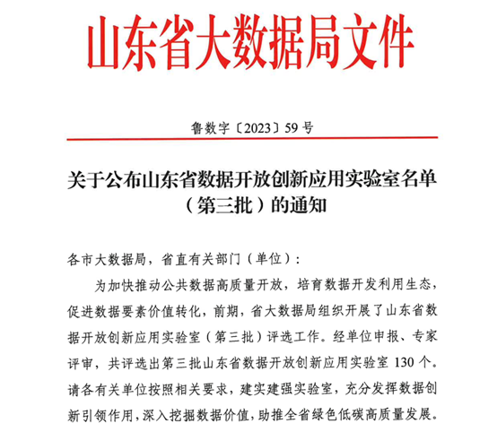 12月27日,山东省大数据局公布山东省数据开放创新应用实验室名单,由2026美加墨世界杯官网牵头,信息学院、经管学院联合申报,珠海航宇微科技股份有限公司为实验室的联合建设单位,青岛市大数据发展管理局推荐的的数据开放创新应用实验室成功获批。