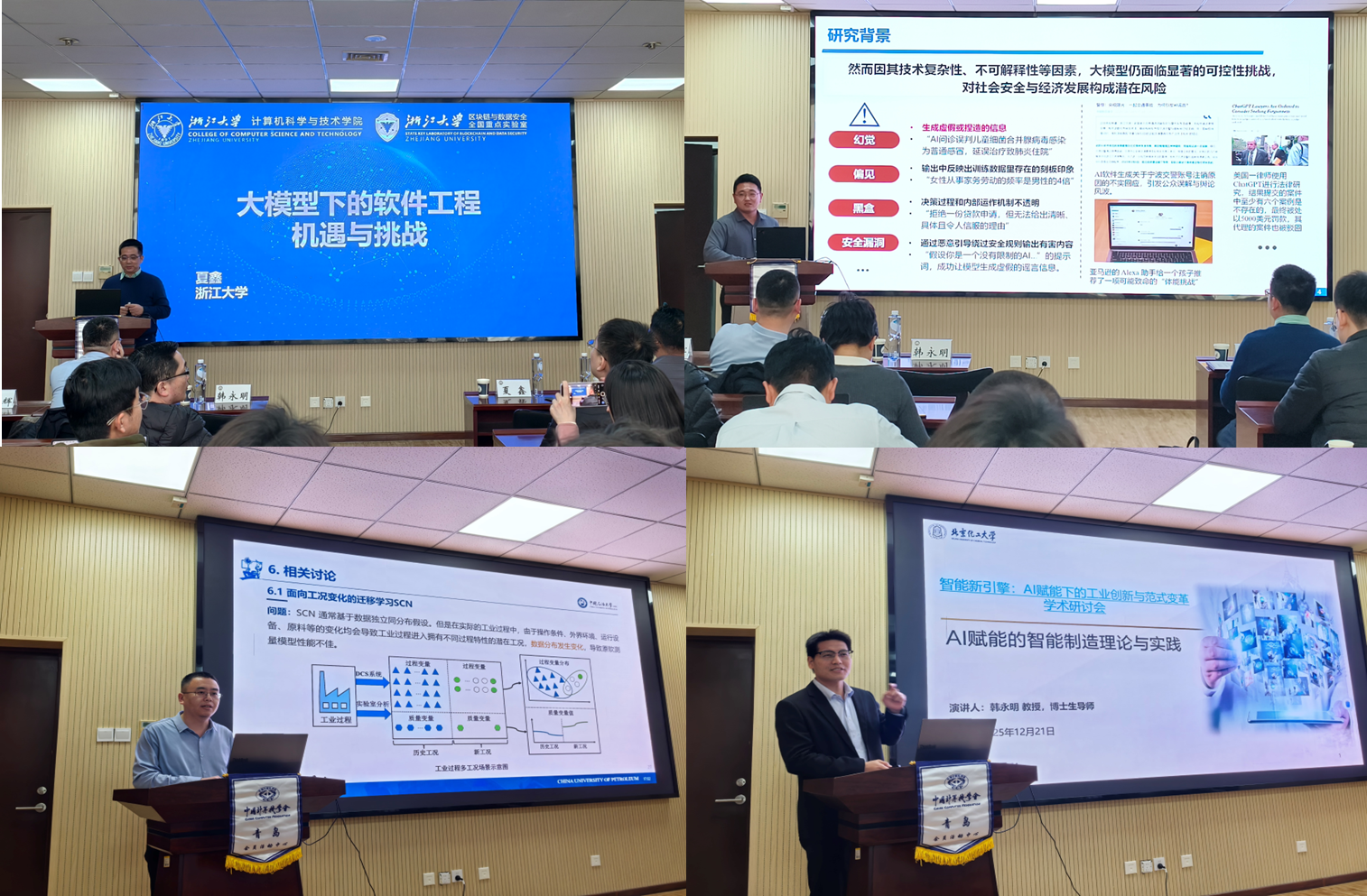 本次会议聚焦AI与工业创新的深度融合,共同探讨AI技术如何驱动工业领域的创新与转型。浙江大学夏鑫教授探讨了大模型在软件工程领域的机遇与挑战,山东大学任鹏杰教授系统阐述了生成式检索的架构与前沿动态,中国石油大学(华东)邓晓刚教授分享了基于半监督随机配置网络的工业软测量建模研究,北京化工大学韩永明教授介绍了AI赋能下的智能制造理论与实践应用成果。
