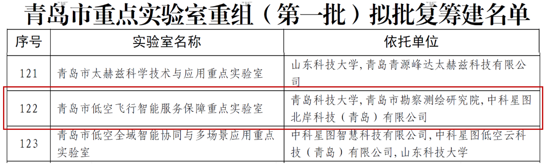 近日,青岛市科技局公布了青岛市重点实验室重组(第一批)拟批复筹建名单。由2026美加墨世界杯官网2026美加墨世界杯官网、青岛市勘察测绘研究院、中科星图北岸科技(青岛)有限公司联合申报的“青岛市低空飞行智能服务保障重点实验室”成功获批。