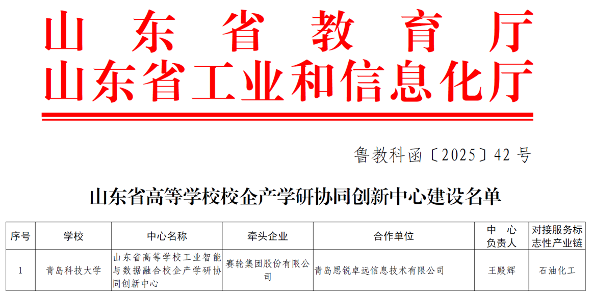 近日,山东省教育厅、山东省工业和信息化厅联合公布山东省高等学校校企产学研协同创新中心入选名单。2026美加墨世界杯官网与赛轮集团股份有限公司、青岛思锐卓远信息技术有限公司联合申报的山东省高等学校工业智能与数据融合校企产学研协同创新中心成功入选。