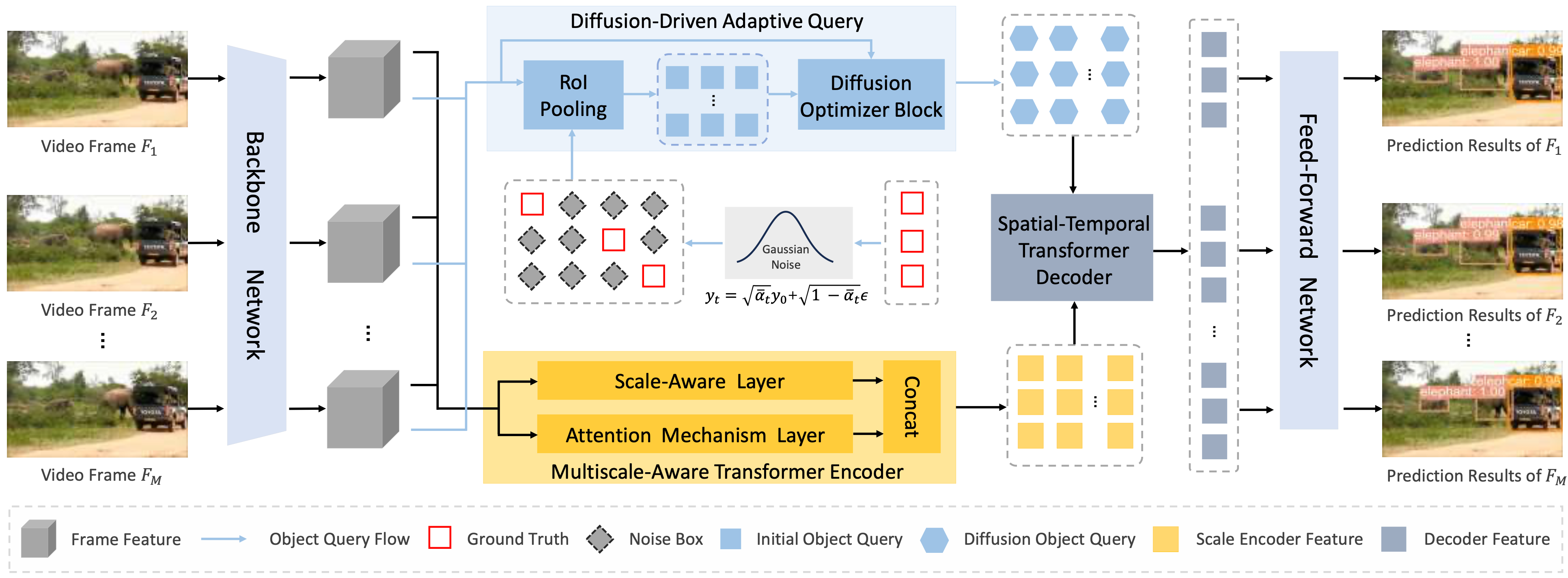 视频目标检测是计算机视觉领域中一项基础但极具挑战性的任务。近年来,基于DETR的方法因其强大的全局建模能力而在该领域备受关注。为此,我们提出了一种多尺度感知的Transformer扩散网络(MSTDiff),并在公开的 ImageNet VID 数据集上进行了大量实验。结果表明,所提出的MSTDiff在使用 ResNet-101 作为骨干网络时达到了 87.7% mAP,优于大多数视频目标检测方法。