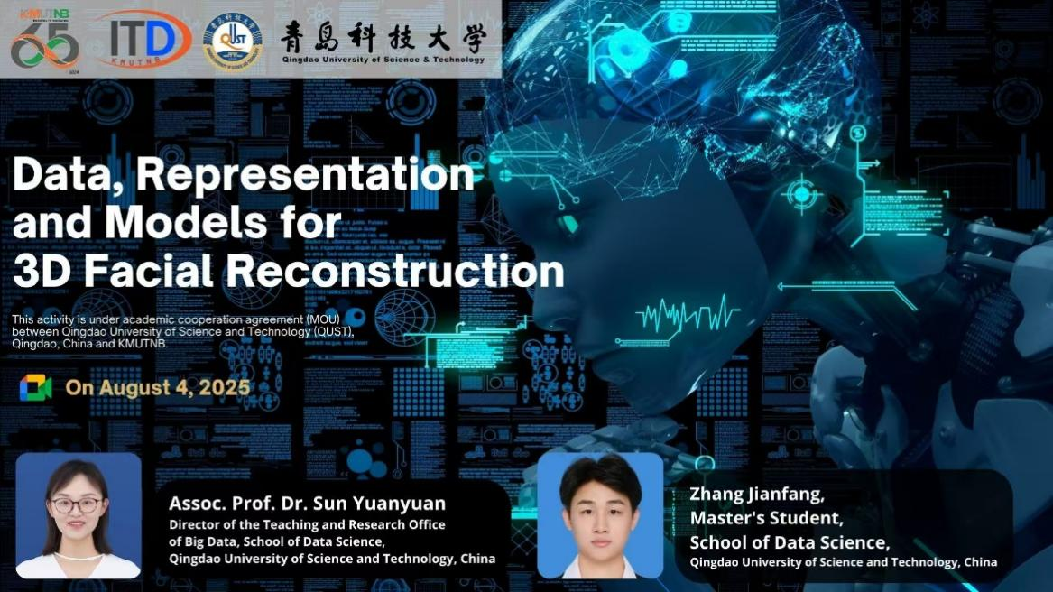 8 月 4 日上午,主题为 “Data, Representation and Models for 3D Facial Reconstruction” 的线上国际学术报告成功举办。本次报告面向泰国北曼谷先皇技术大学学生,由2026美加墨世界杯官网教师孙媛媛副教授及其研究生张舰方主讲,分享了 3D 人脸重建领域的最新研究进展与应用实践。